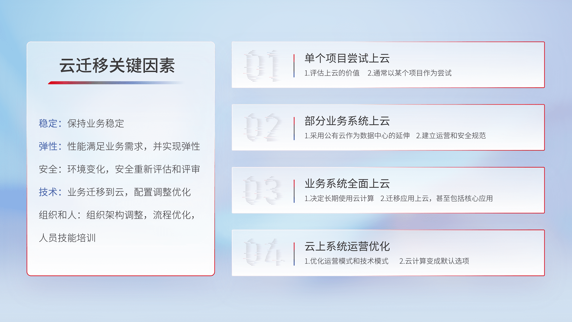 结合实际业务,,从规划设计、、、云平台选型、、、云原生改造、、数据迁移、、、集成交付,,迁移全过程为客户识别最佳上云路径,,,做好风险识别管理,,设计网络架构、、、身份权限、、、、安全审计合规、、、、操作审计、、、日志审计、、、监控告警策略、、、多站点容灾设计等,,,对云上基础设施进行整体规划,,,提升IT治理水平,,,以满足弹性、、高可用、、、高性能的需求。。
