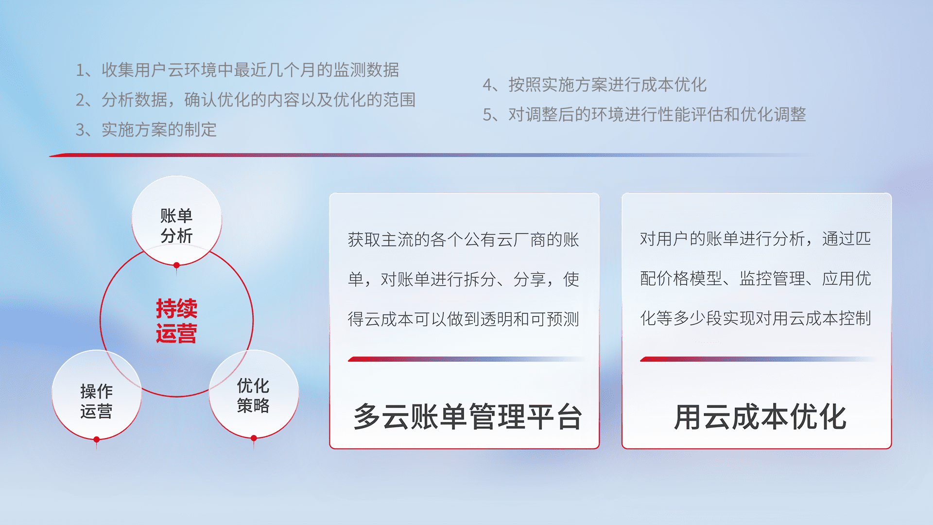 通过多云纳管,,,以统一的资源数据模型把客户的云资源进行抽象和封装,,进而实现对多云资源的统一操作,,保障云资源管理的可靠性、、、、稳定性与可用性。。。量身定制化运维内容,,配置、、、开发运维、、补丁管理、、、备份、、监控、、、、认证和访问管理、、审计和日常巡检等,,,,保障在用云过程中的可靠度,,,,稳定度以及高可用率。。