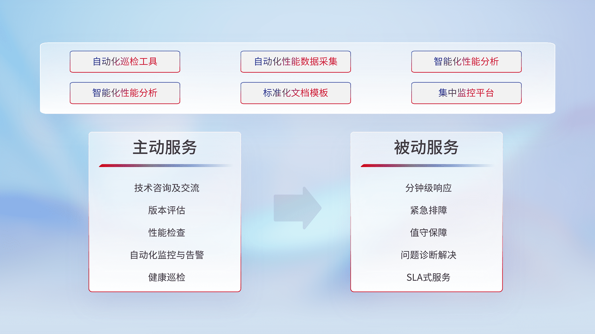 智能化工具和标准化文档,,,,保障服务质量,,,,提供主动服务(包含技术咨询、、版本评估、、性能检查、、、自动化监控与告警、、、健康巡检)和被动服务包含(分钟级响应、、、紧急排障、、、值守保障、、、、问题诊断解决、、、SLA服务)。。。。